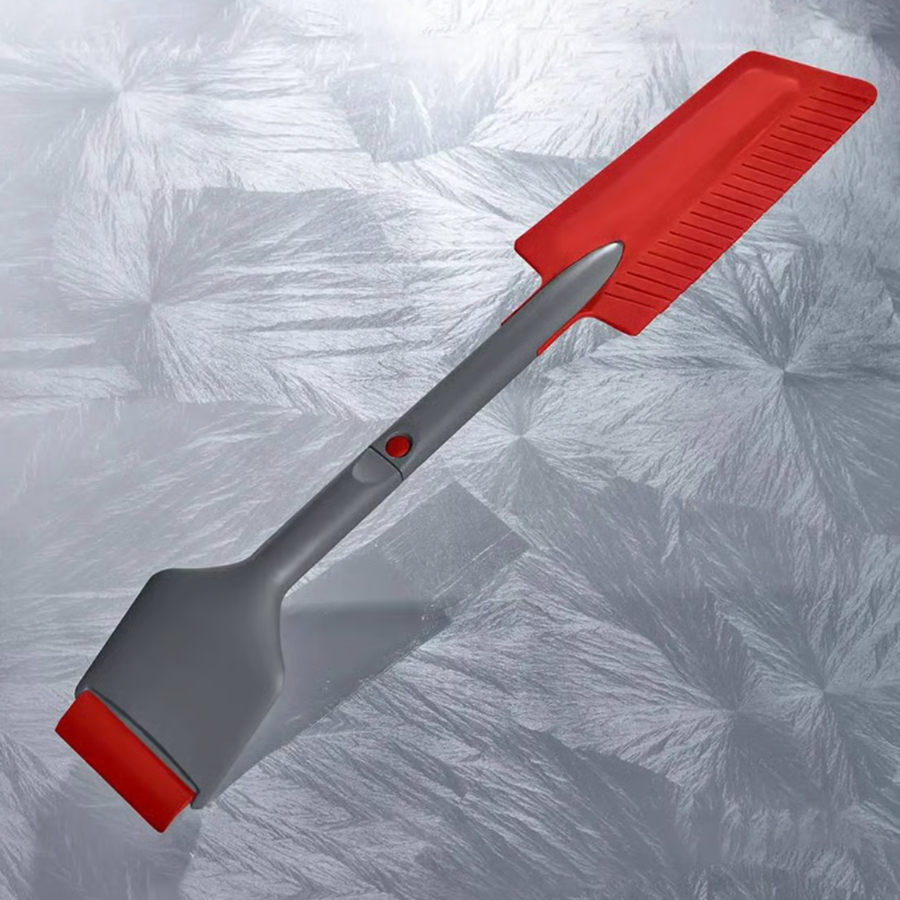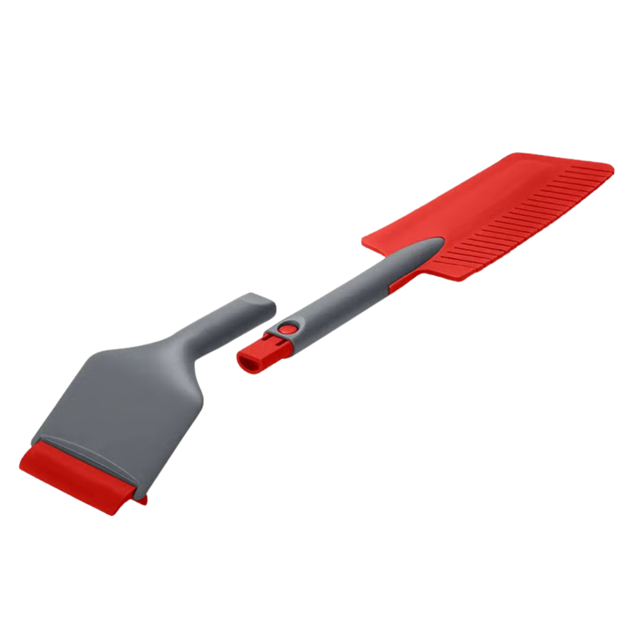 ice scraper, snow sweeper, and water squeegee in one. Red and grey, 60 cm length with flexible rubber bristles.