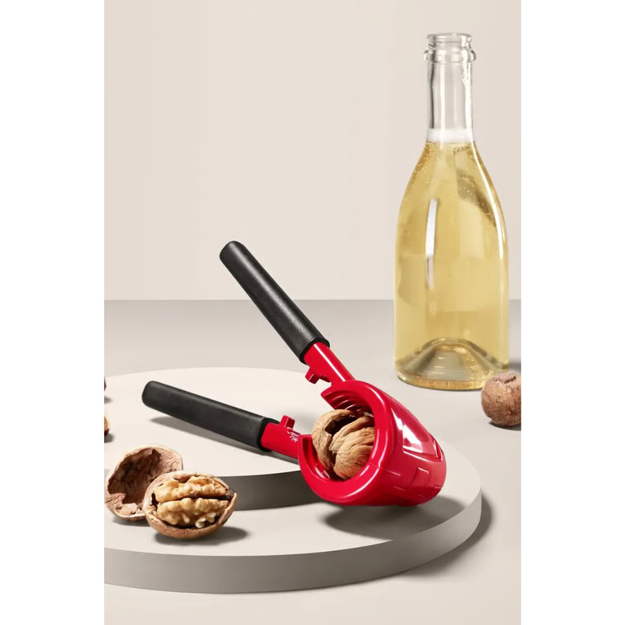 Tchibo 3-in-1 Nutcracker, Glass & Bottle Opener in red – stainless steel, multifunctional tool for cracking nuts and opening bottles. Compact, durable, and easy to use.