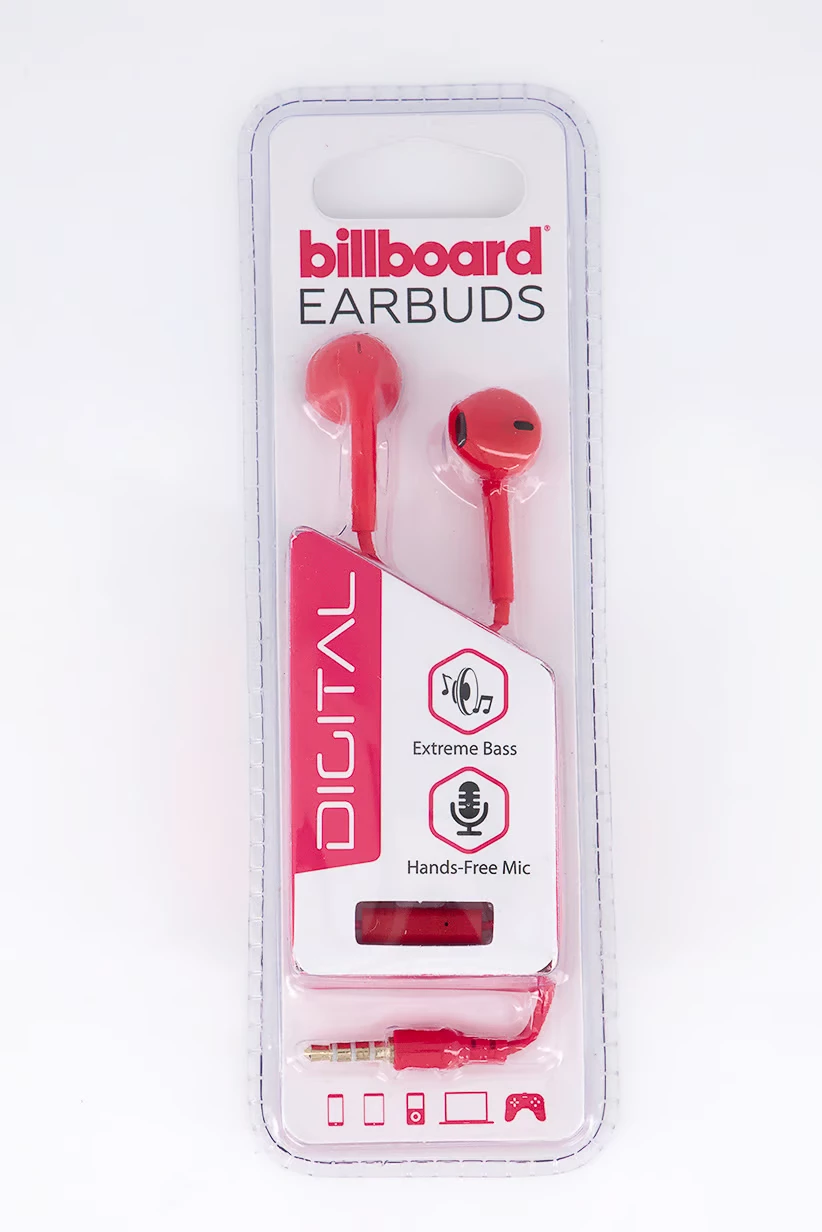 Enjoy extreme bass and crystal-clear sound with the Billboard Premium Earbuds in red. Featuring a tangle-free round cable and an in-line microphone for hands-free calls, these premium earbuds deliver high-quality audio in a compact design. Whether you're listening to music or taking calls, the extreme bass enhances your listening experience, making these earbuds a must-have for music lovers. The in-line mic adds convenience, making it easy to switch between calls and music without hassle.