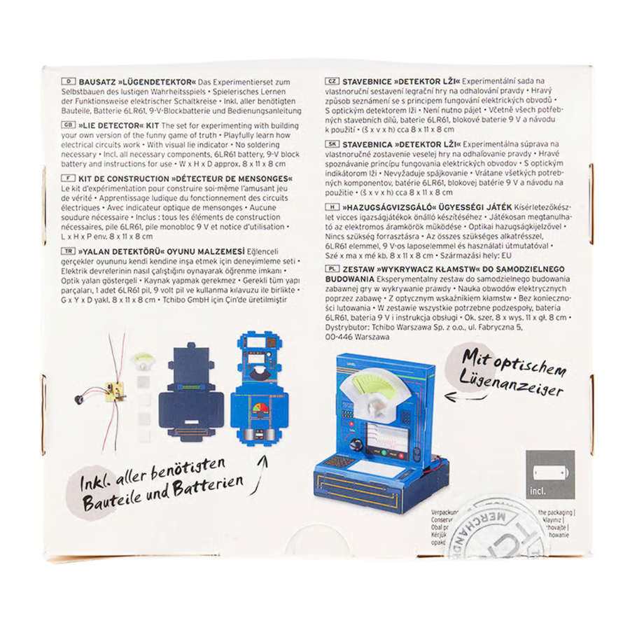 Unleash curiosity and fun with the Tchibo DIY Lie Detector Test, a playful experiment set that teaches children how electrical circuits work. Designed for young learners, this engaging kit allows kids to build their very own lie detector game without the need for soldering. With an optical lie indicator and included battery, the set makes science interactive, educational, and entertaining. Perfect for playdates, family fun, or classroom activities, this DIY project encourages hands-on learning while sparking creativity.