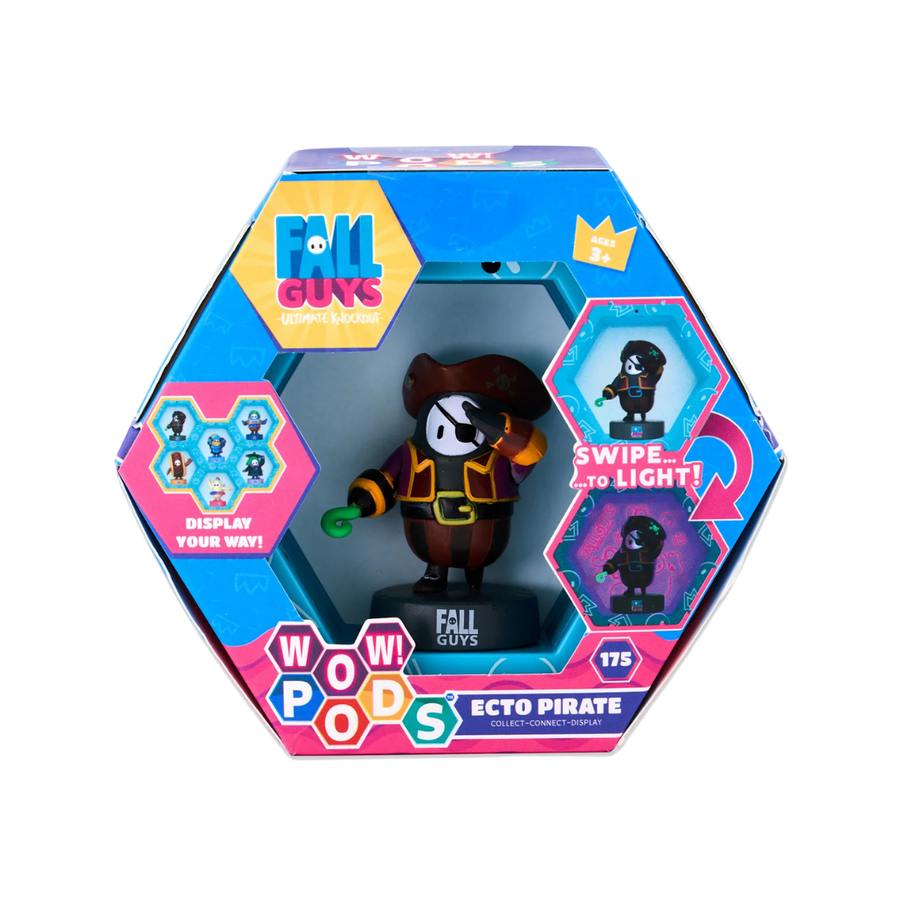 Bring the fun of Fall Guys to life with the Wow Pods Ecto Pirate figure in grey! This collectible is housed in a hex-shaped pod featuring built-in UV lights that activate with a simple swipe. Watch your favorite character light up with hidden mystery features revealed instantly. Create a dazzling display by connecting multiple Wow Pods together—build a wall, design a shelf setup, or spell out your name. Perfect for fans of all ages who love interactive, light-up collectibles.