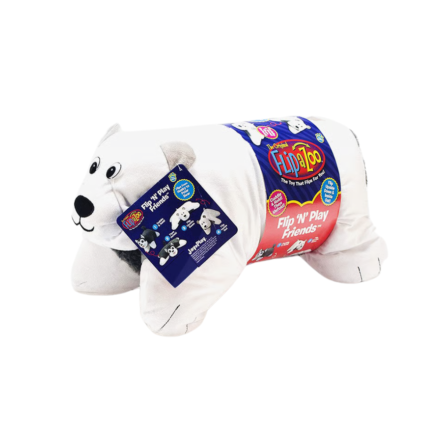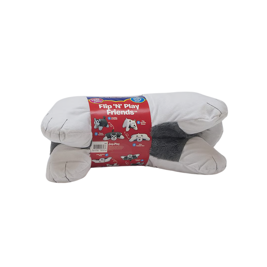 Get twice the cuddles with Jay at Play's Flip N Play Friends! This soft and huggable pillow toy flips inside out to reveal a cuddly Husky on one side and a lovable Polar Bear on the other. Designed with premium, ultra-soft polyester, it's the perfect companion for nap time, road trips, and everyday play. Whether you're at home or away, this 2-in-1 stuffed animal is a comforting friend your child will love to snuggle with.