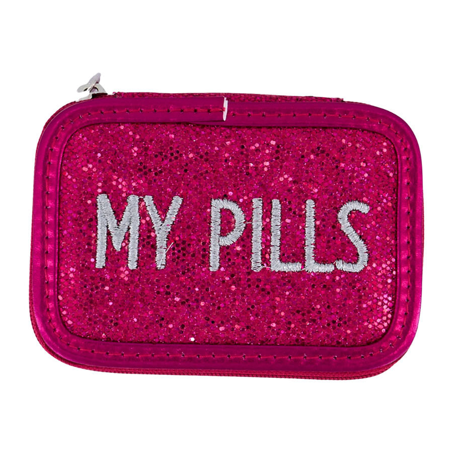 Miamica Glitter Pill Case in dark pink – a compact, stylish pill organizer perfect for travel. Made from plastic and polyester with a glittery finish.