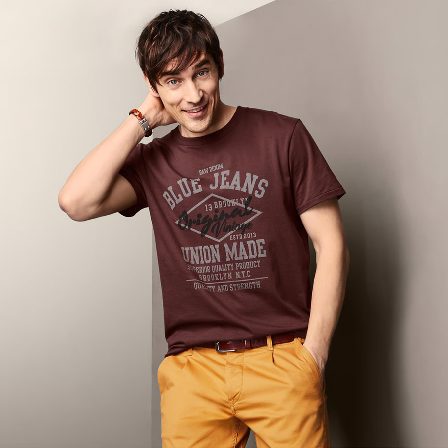 Tchibo Men's Graphic Print T-shirt in Bordeaux Red, made from 100% organic cotton. Comfortable, stylish, and ideal for all-season wear.