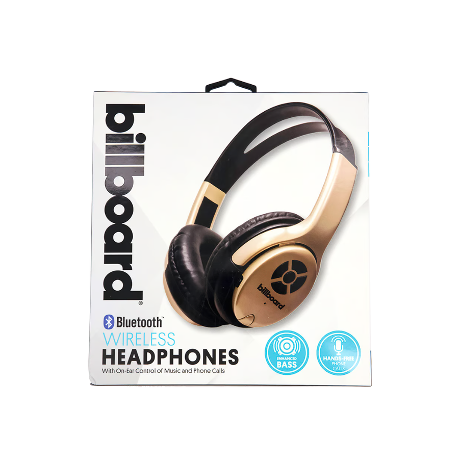 Billboard Men's Wireless Headphones in gold. Crystal-clear sound with VOICE mode and noise cancellation. Stylish design and 40mm driver for rich audio.