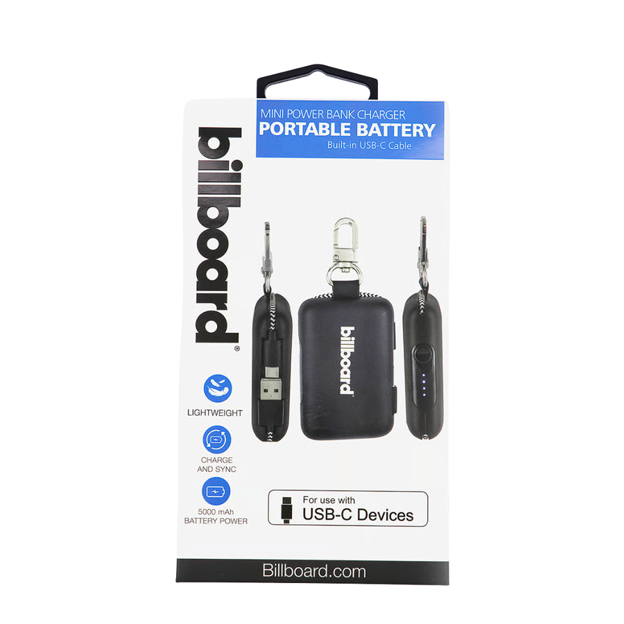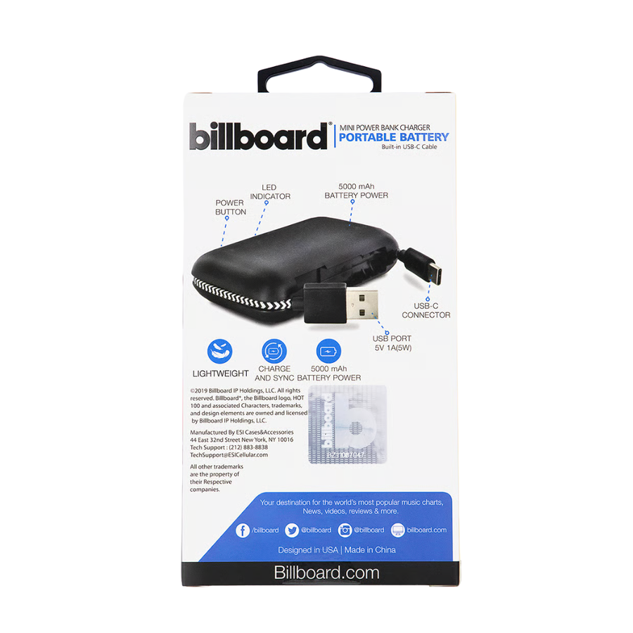 Stay charged on the go with the Billboard Mini Power Bank. This compact, portable 5000 mAh battery ensures your devices never run out of power when you need them most. Designed for ultimate convenience, it features a built-in USB-C cable, eliminating the need to carry extra cords. Its sleek black plastic design is both durable and stylish, making it an essential travel accessory.