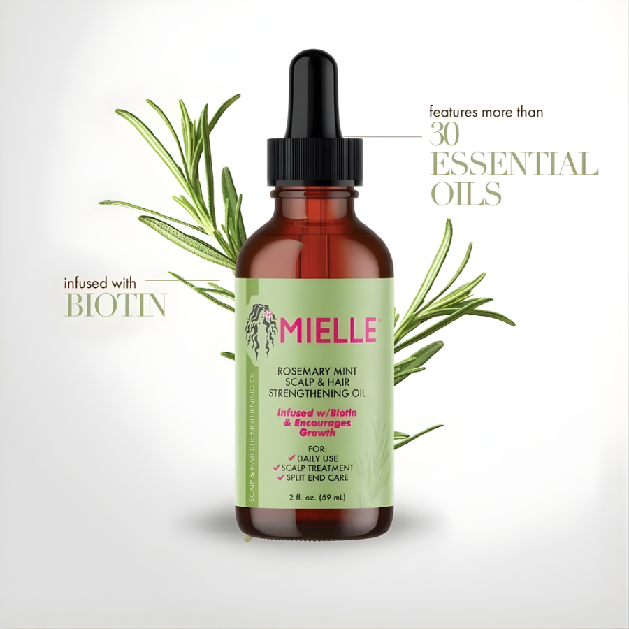 Mielle Rosemary Mint Scalp and Hair Strengthening Oil ( 59 ml ). Infused with Biotin for hair growth, split end treatment, and dry scalp relief.