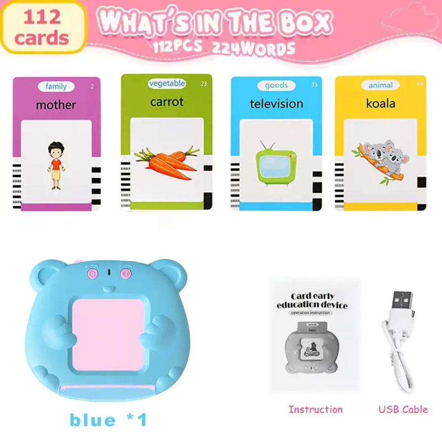 Help your child explore the world of words with the Shatoora Talking Flash Cards. Designed for kids aged 3 to 6, this interactive pocket-sized learning device comes with 112 double-sided cards featuring 224 commonly used English words across 12 fun and educational themes. Simply insert a card into the device, and it will automatically pronounce the word—making language learning engaging, playful, and effective. Whether at home or on the go, this lightweight and durable device is a wonderful educational gift that encourages early speech, listening, and reading skills.