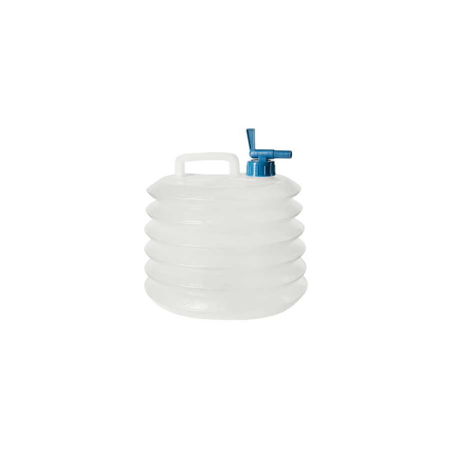 Tchibo Foldable Water Canister – transparent, lightweight, and durable with stopcock and handle. Perfect for outdoor adventures, travel, or emergency water storage.