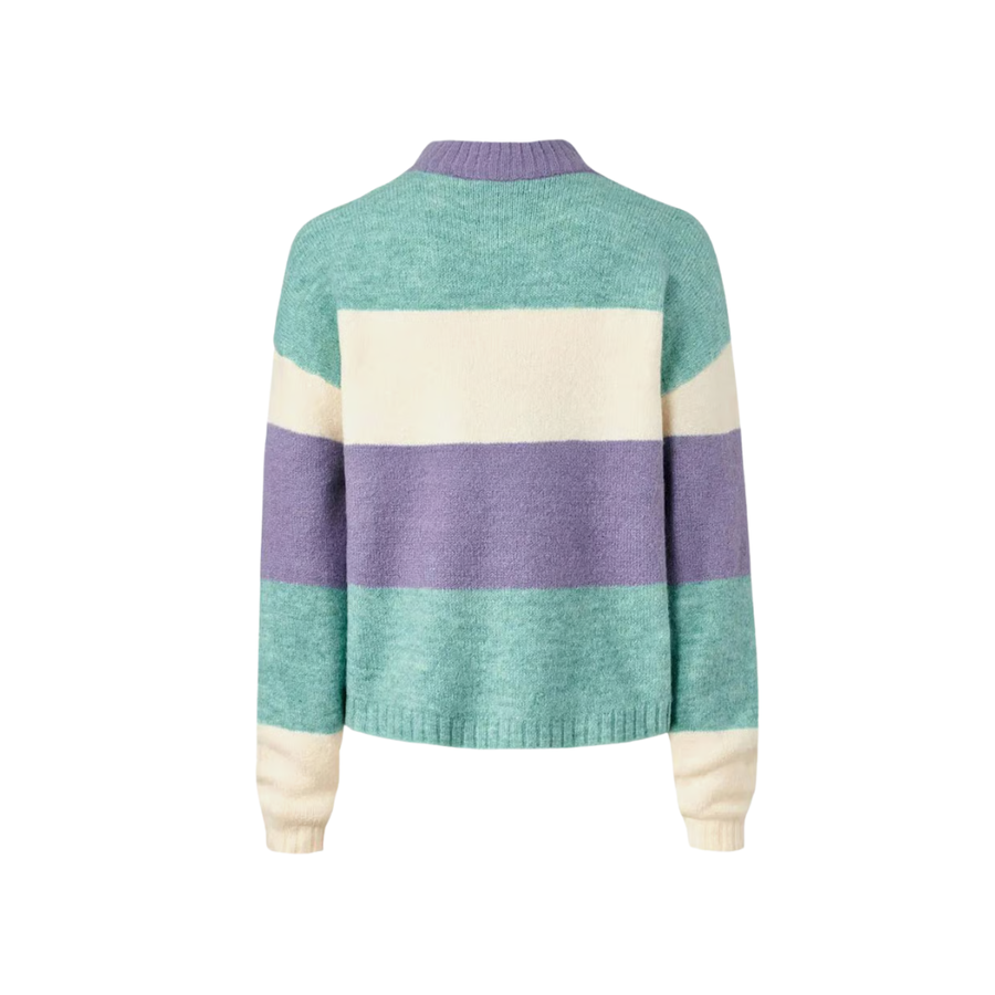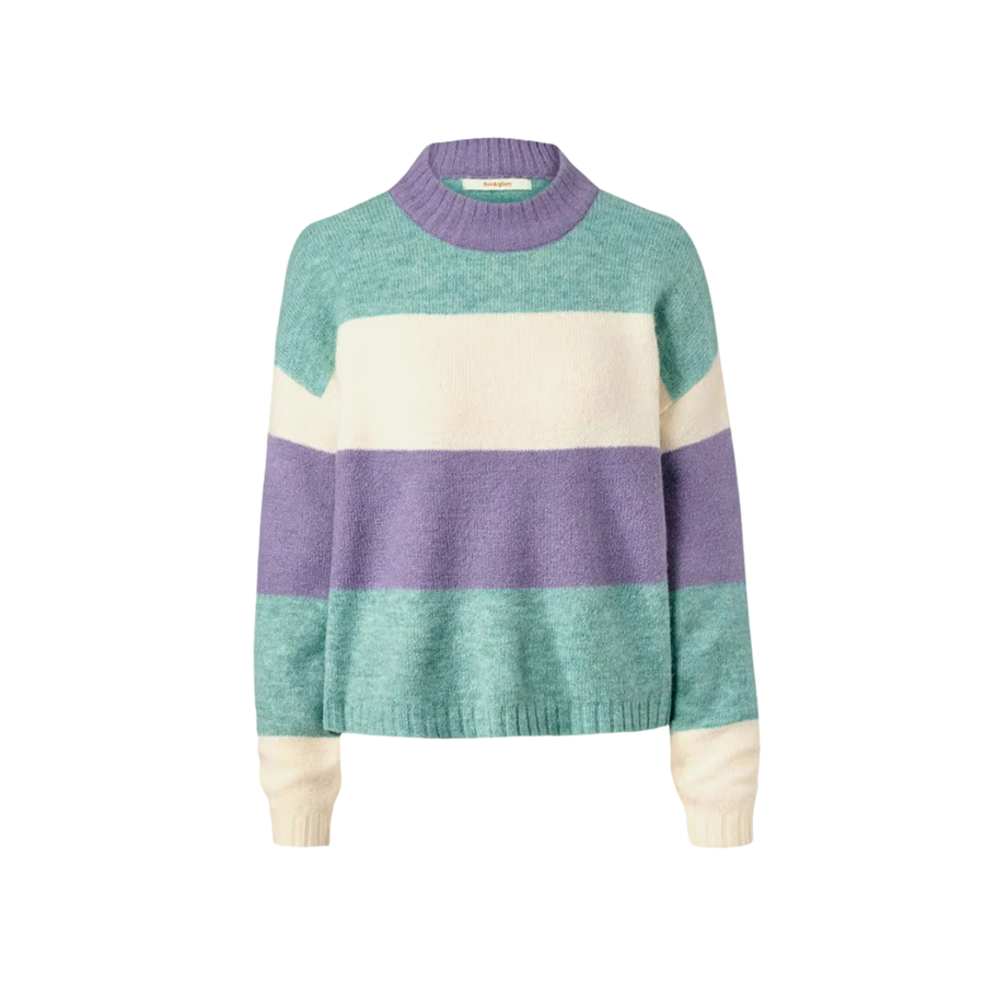 Tchibo Women Crew Neck Stripe Sweater in Purple Combo. Lightweight, machine washable, and made from a soft wool blend. Stylish textured pattern for casual wear!