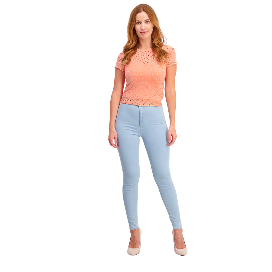 Add a touch of effortless charm to your everyday wardrobe with this Sinsay Eyelet Short Sleeve Top in a soft peach hue. Designed with a delicate textured pattern and a flattering round neckline, this top combines comfort and style in one easygoing piece. The blend of polyester and elastane ensures a breathable, flexible fit, perfect for warm weather and casual days out.