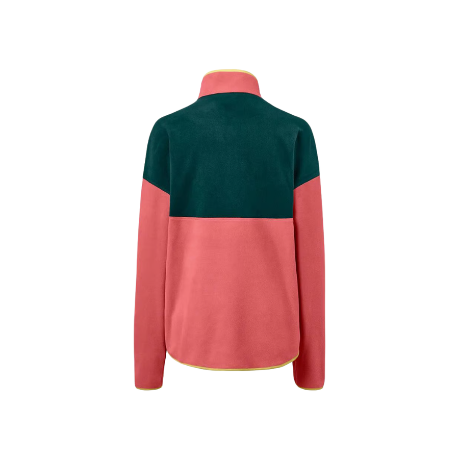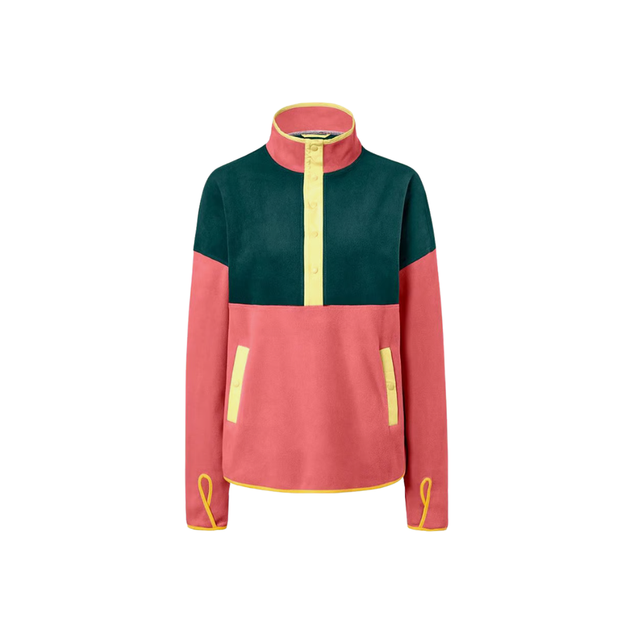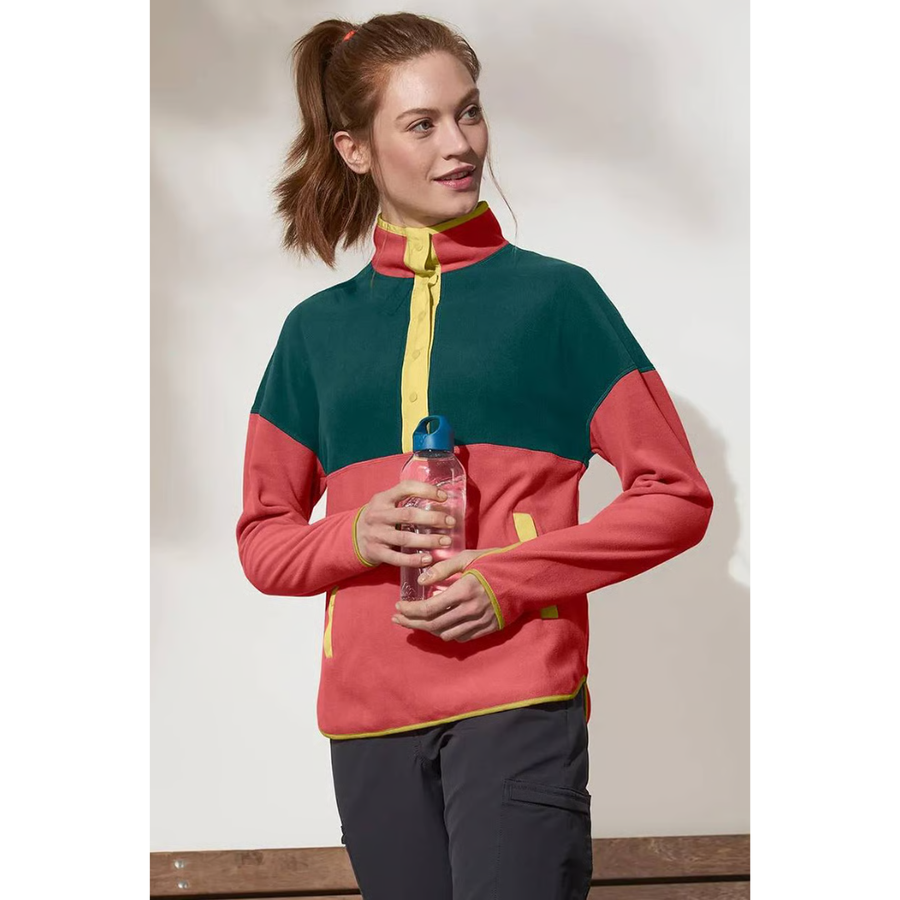 Tchibo Women’s High Neck Fleece Sweatshirt in green and pink. Heat-insulating, breathable, and moisture-wicking with colorblock design.